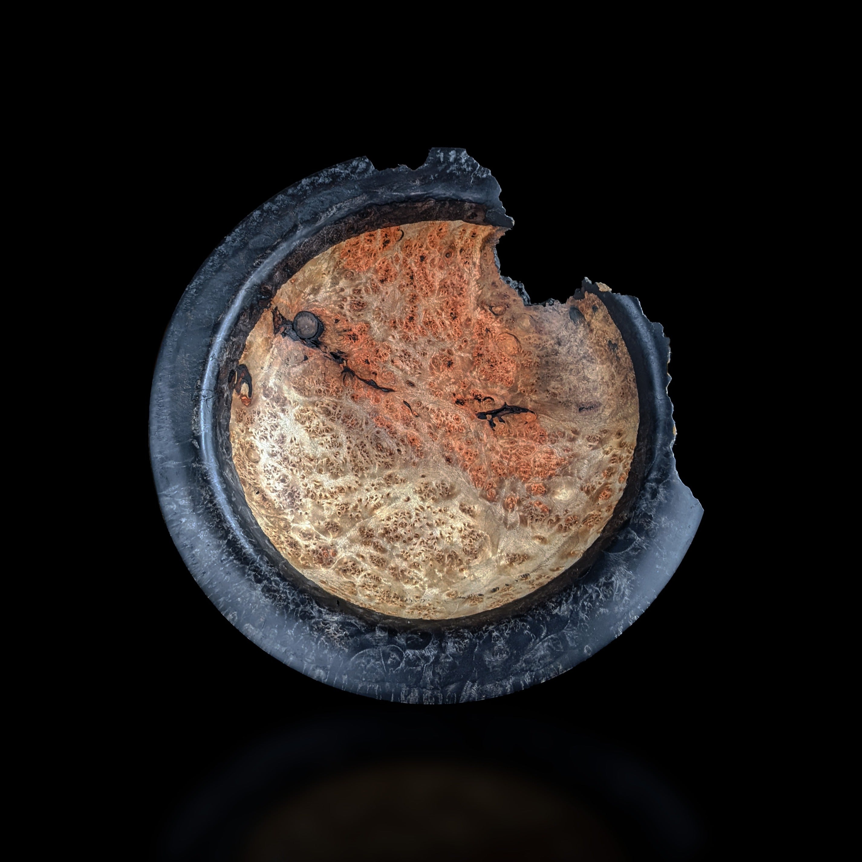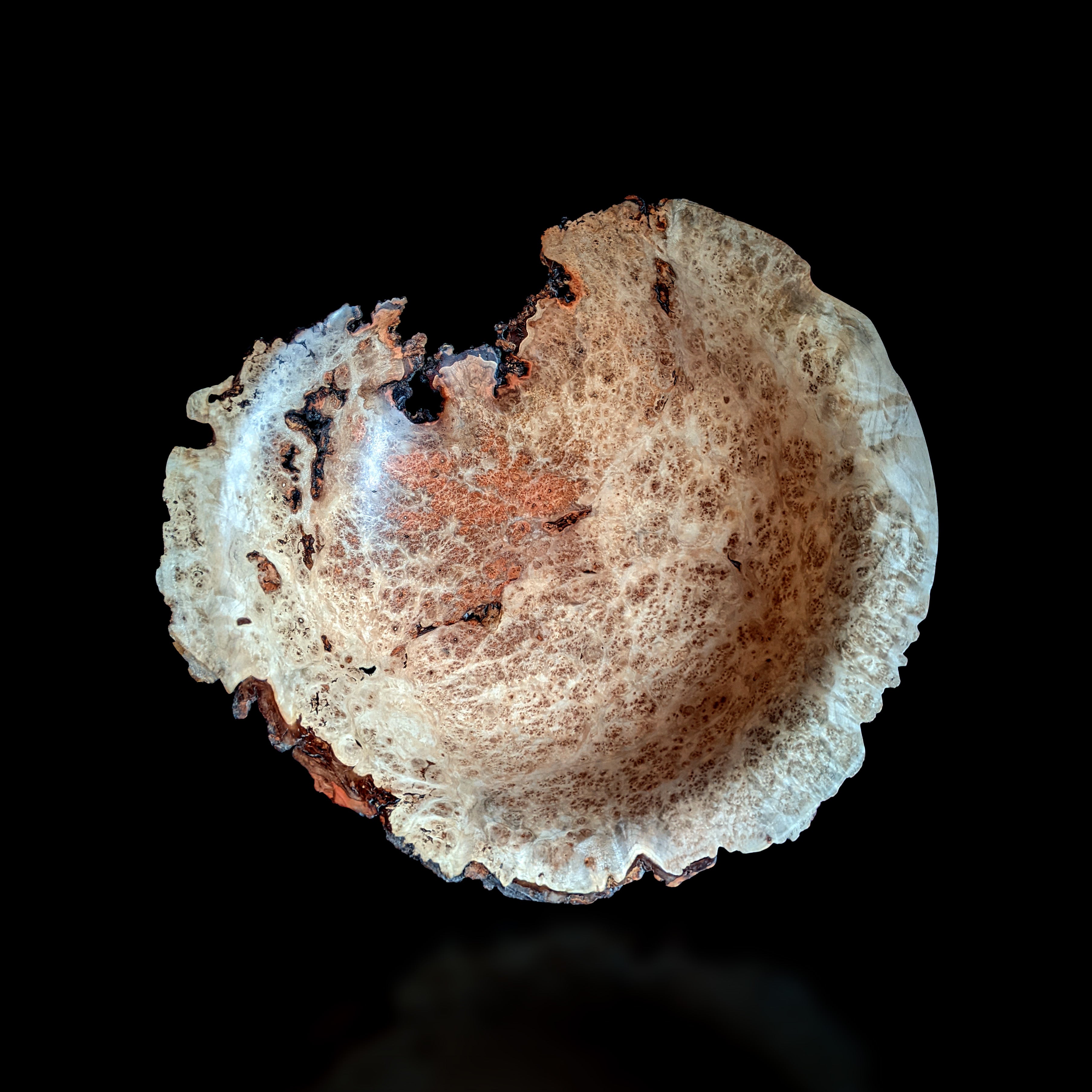 The turning process has revealed the fascinating, unique grain patterns of natural burr wood.